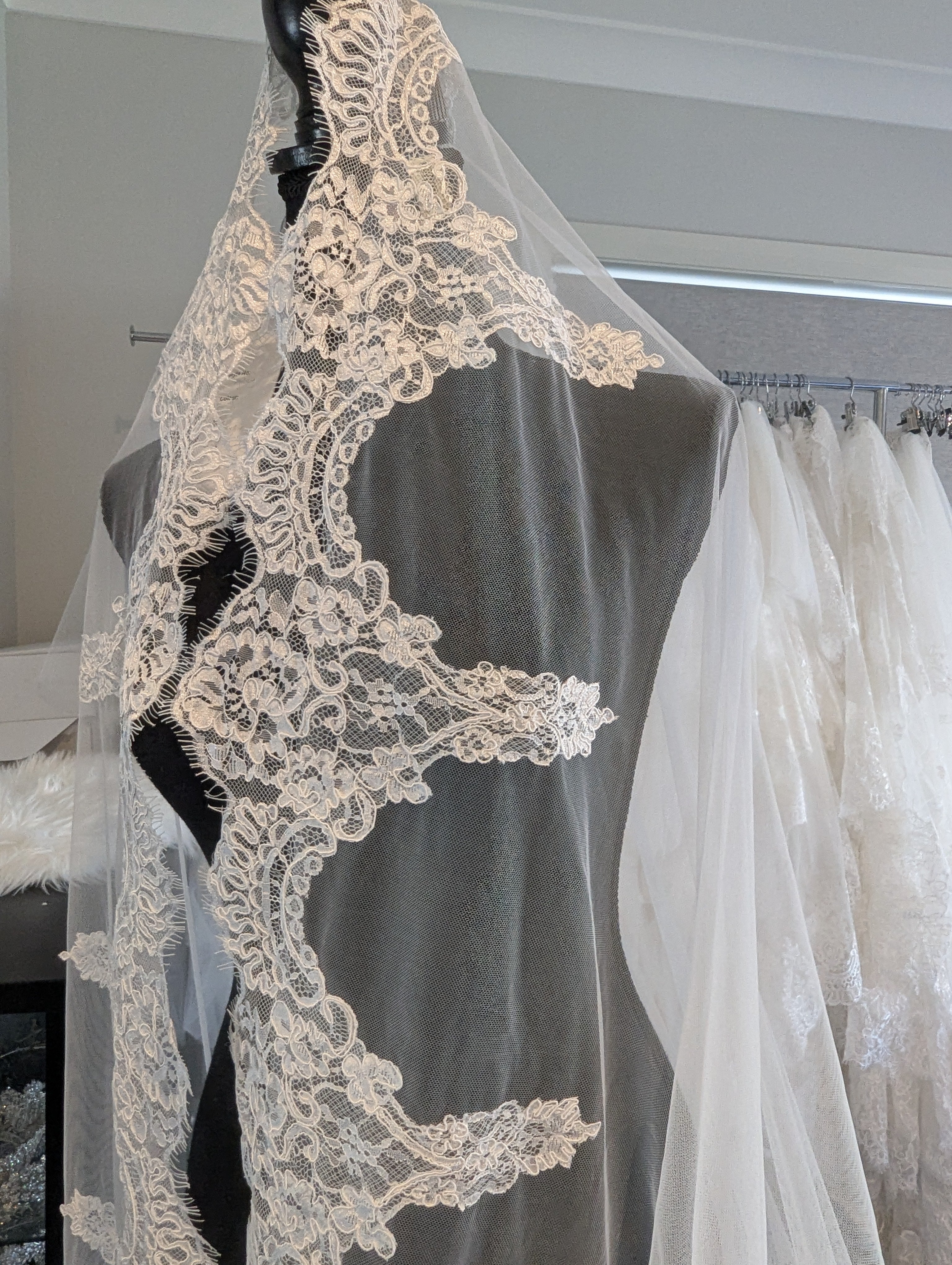 Our Abbey mantilla lace veil is a stunning and elegant bridal accessory that exudes romance and sophistication. Made from delicate lace fabric, this veil features intricate floral and lace patterns that are meticulously woven together to create a stunning, sheer layer that drapes beautifully over the bride's head and shoulders.