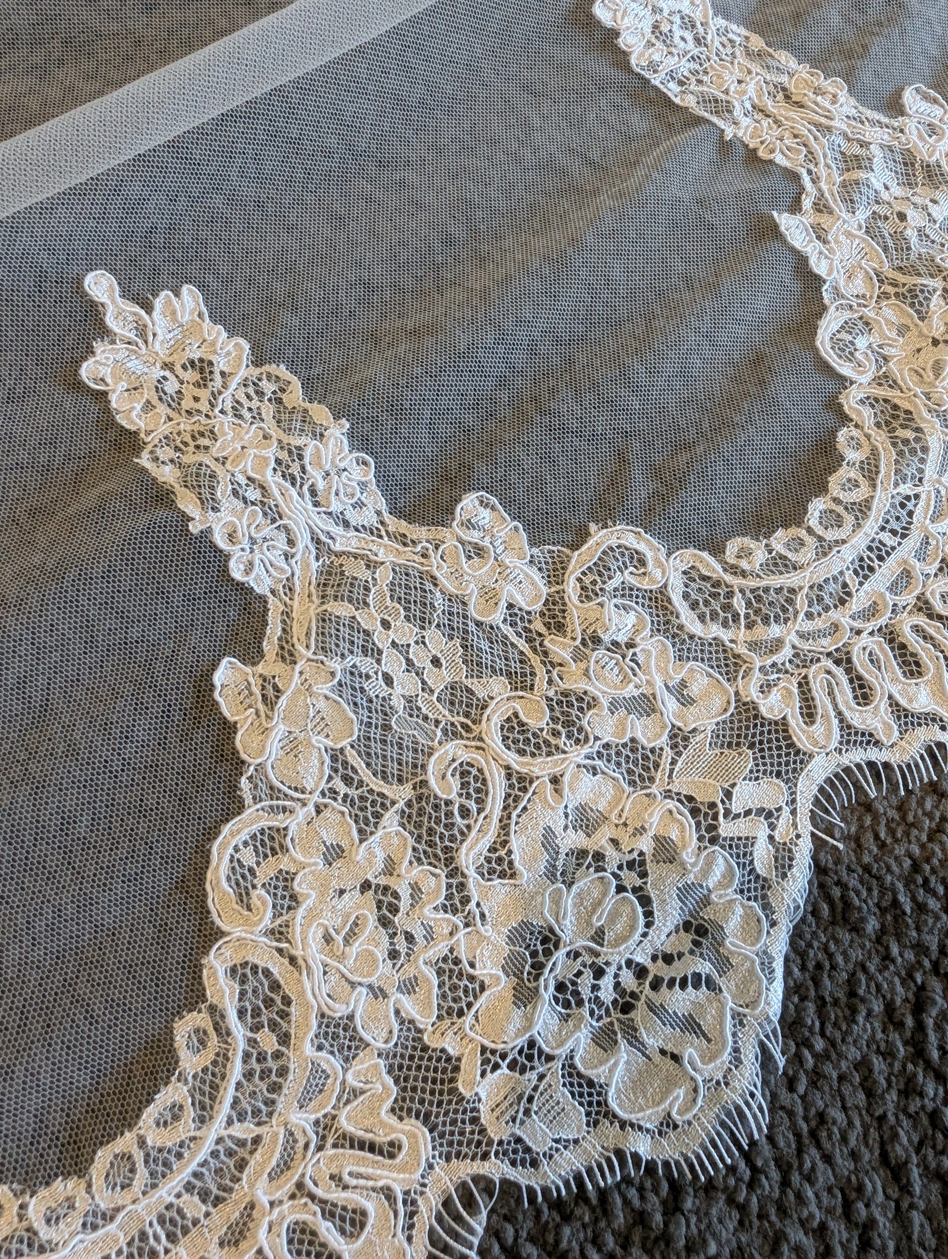 The mantilla lace veil extends all the way around, depending on the desired length. It is attached to a metal comb that is discreetly tucked into the bride's hair, allowing the veil to stay in place throughout the wedding ceremony and reception.This beautiful Lace Applique Wedding Veil is the perfect modern touch to any classic bridal dress.